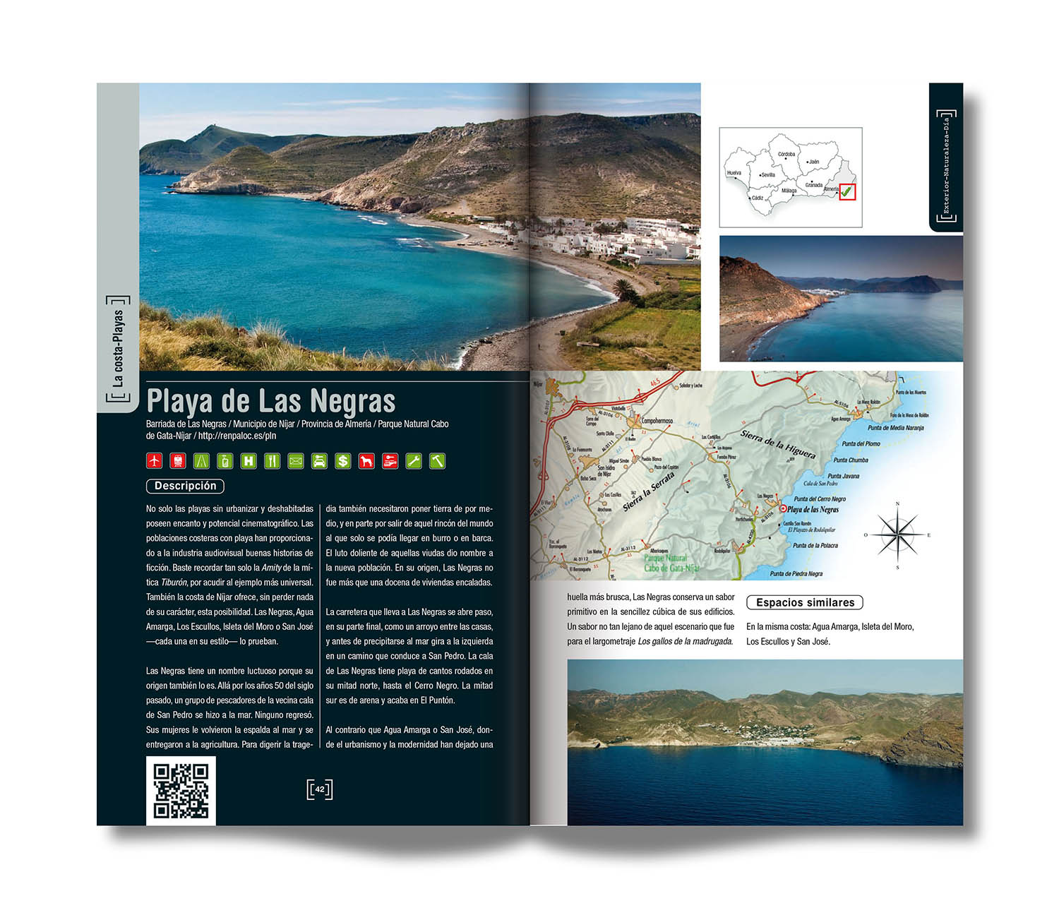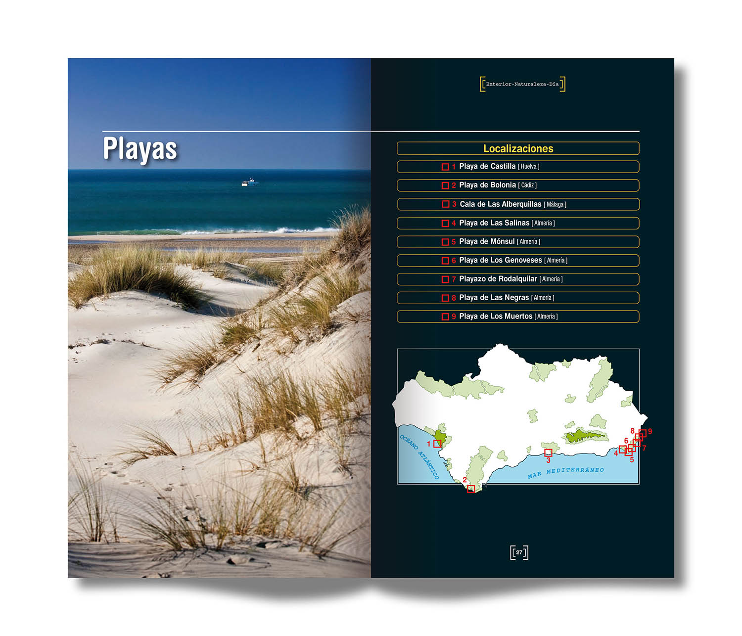 "El grueso de la guía lo compone, la relación de localizaciones en espacios naturales andaluces, que se han distribuido en seis capítulos: La costa, Agua, Paisaje de monte y bosques, Paisaje desnudo, La huella humana y El paisaje herido."