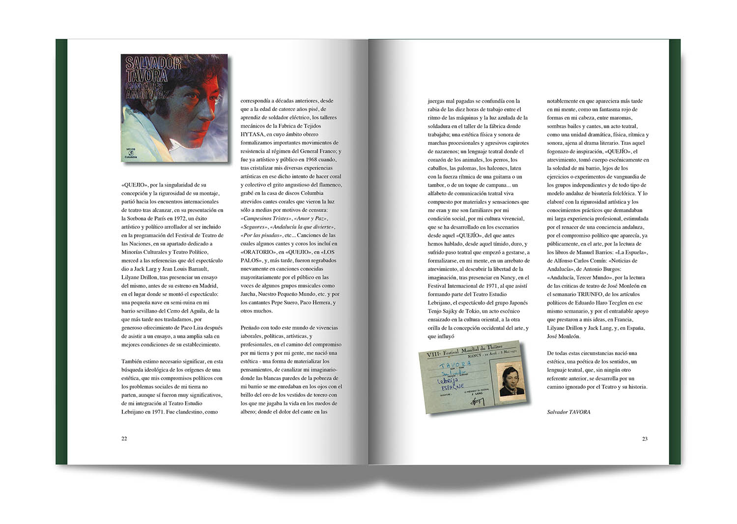 "Esta publicación sienta las bases estéticas para el desarrollo de un lenguaje teatral nacido de vivencias personales. El trabajo artístico de Salvador Távora es autodidacta y realizado a través de un largo periodo de tiempo y esfuerzo, nada mejor que las relexiones del propio creador durante sus años de trabajo."