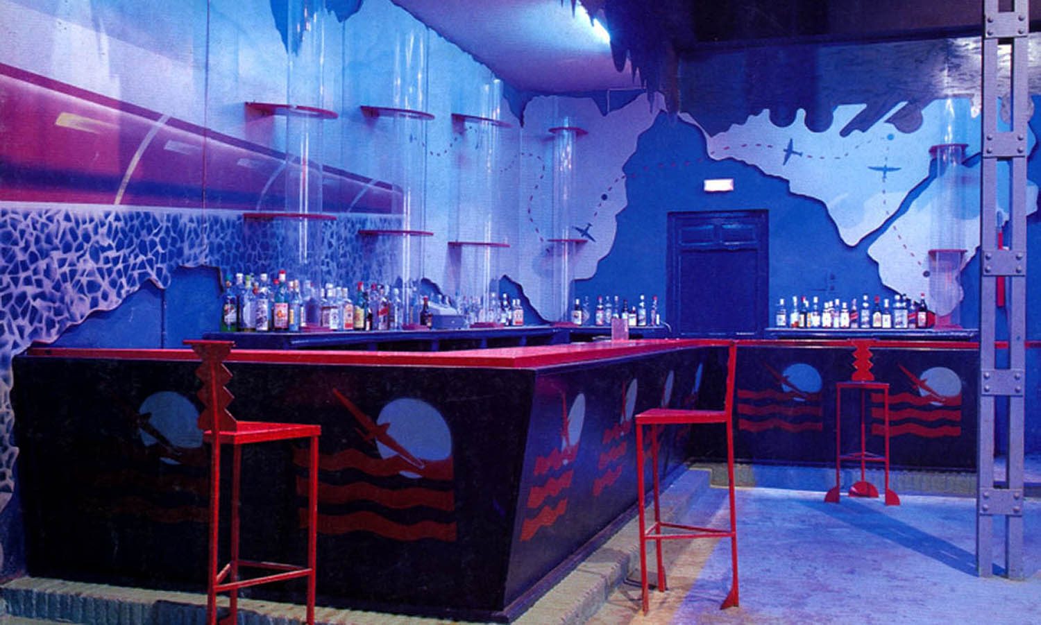 Las columnas también se forraron de acero inoxidable para simular las chimeneas de los barcos. Las paredes se pintaron con manchas corpóreas en tonos azules y amarillos (mar y sol).